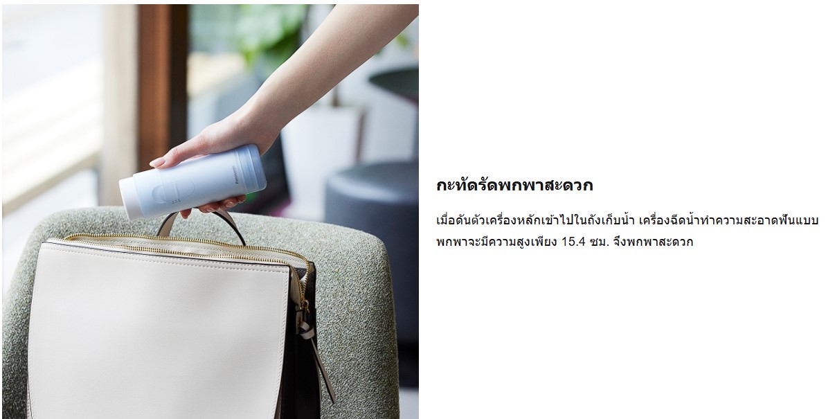 เมื่อดันตัวเครื่องหลักเข้าไปในถังเก็บน้ำ เครื่องฉีดน้ำทำความสะอาดฟันแบบพกพาจะมีความสูงเพียง 15.4 ซม. จึงพกพาสะดวก