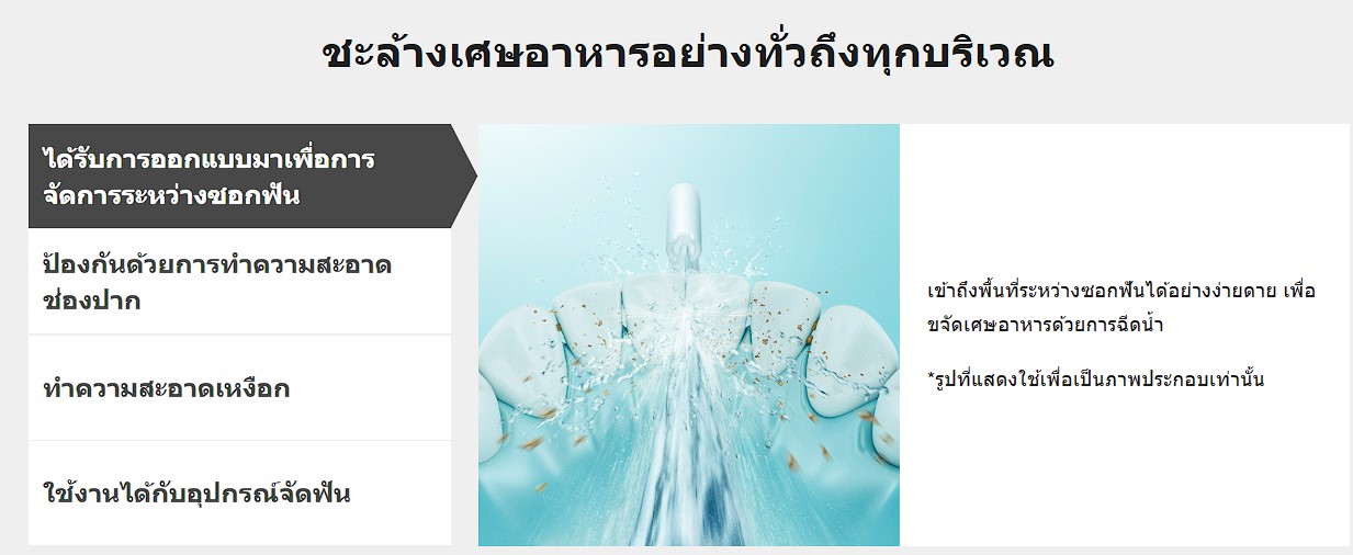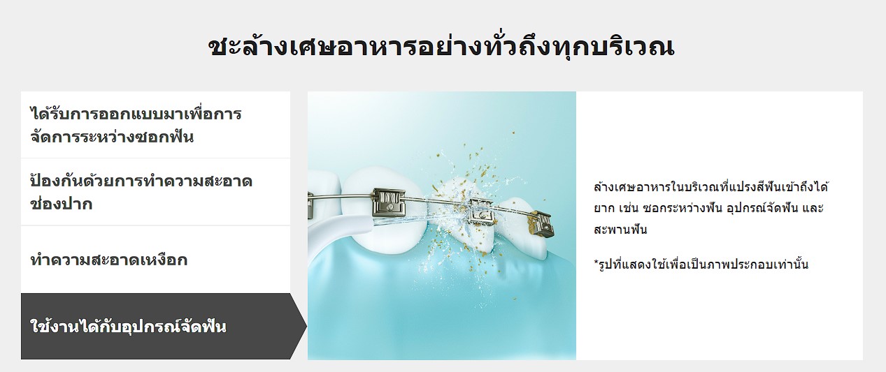 ล้างเศษอาหารในบริเวณที่แปรงสีฟันเข้าถึงได้ยาก เช่น ซอกระหว่างฟัน อุปกรณ์จัดฟัน และสะพานฟัน