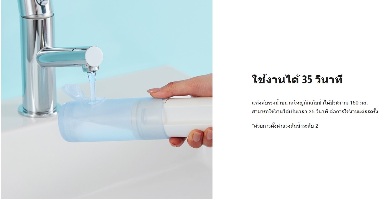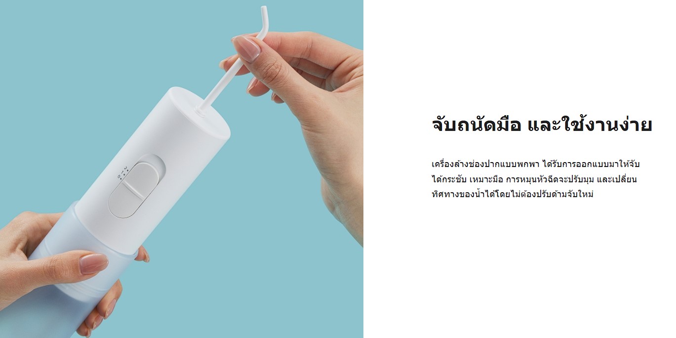 เครื่องฉีดน้ำทำความสะอาดฟันแบบพกพาจะล้างเศษอาหารที่ติดอยู่ระหว่างซอกฟัน ช่องปาก และรอบๆ อุปกรณ์จัดฟันออกด้วยการฉีดน้ำ ตัวเครื่องสามารถใช้งานได้สะดวก ทุกที่ทุกเวลา เนื่องจากทำงานโดยใช้แบตเตอรี่ ทั้งยังได้รับการออกแบบมาให้พอดีกับฝ่ามือ จัดเก็บ และพกพาได้ง่าย คุณจึงสามารถดูแลสุขภาพฟันได้สะดวกในทุกที่