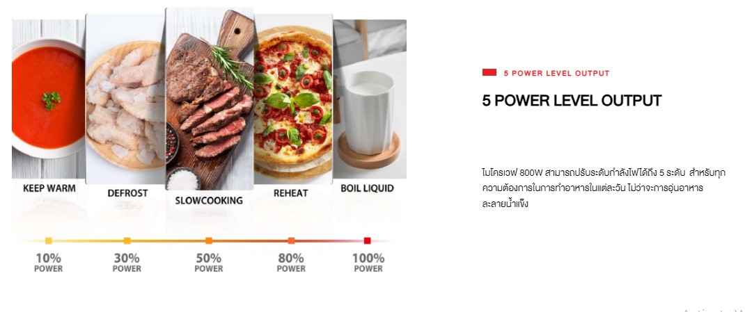 ไมโครเวฟ 800W สามารถปรับระดับกำลังไฟได้ถึง 5 ระดับ สำหรับทุกความต้องการในการทำอาหารในแต่ละวัน ไม่ว่าจะการอุ่นอาหาร ละลายน้ำแข็ง