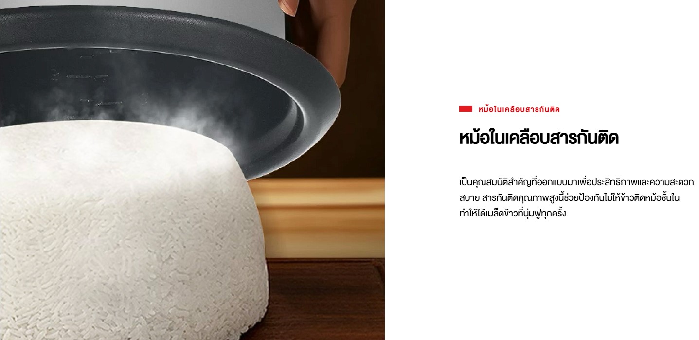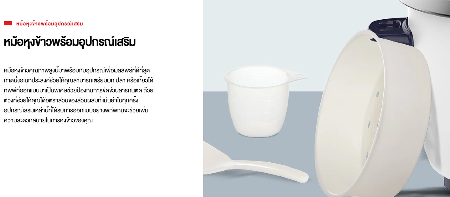 #หุงเร็ว อร่อยทันใจ หม้อในอลูมิเนียม หนา 1 มม. เคลือบกันติดทำความสะอาดง่าย ฟังก์ชันอุ่นอัตโนมัติ รักษาอาหารให้อุ่นพร้อมทานเสมอ ฝาแก้วใส ช่วยให้มองเห็นอาหารได้ง่าย อุปกรณ์เสริมครบครัน ทั้งถาดนึ่ง ทัพพี และถ้วยตวง