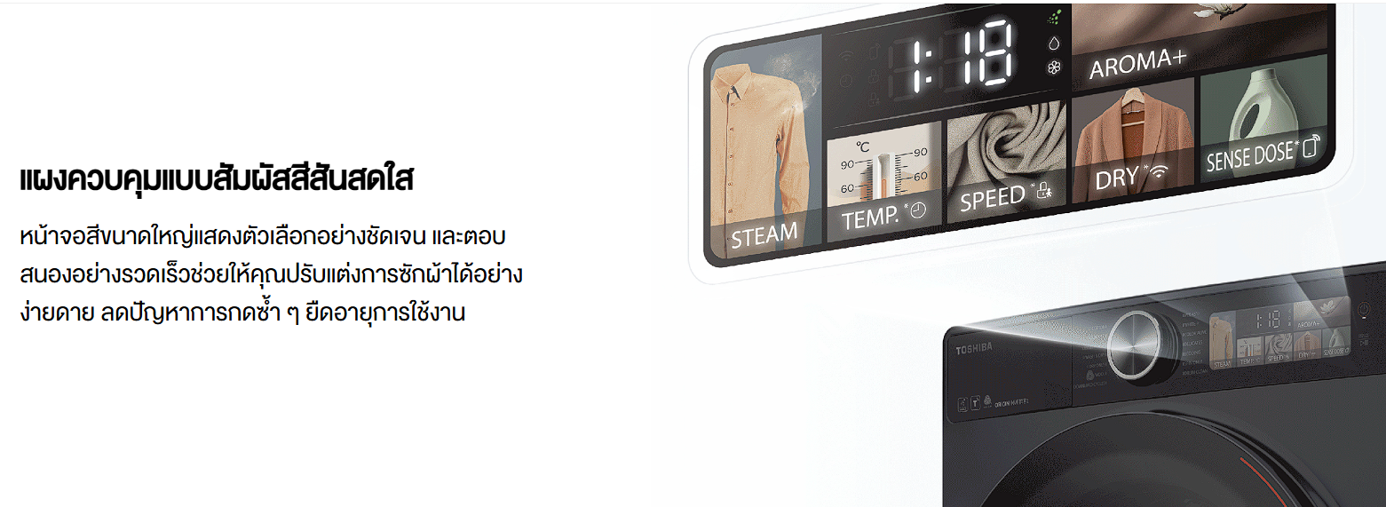 #แผงควบคุมแบบสัมผัสสีสันสดใส ช่องใส่ผ้ากว้าง 365 มม. ใส่ผ้าง่ายกว่าเดิม ถังซักกว้าง 535 มม. ใหญ่จุใจ THE GREATWAVES 2.0 พลังน้ำ 5 รูปแบบ ประหยัดไฟ ประหยัดเวลา ประหยัดน้ำ GREATSTEAM ยับยั้งแบคทีเรีย ผ้าสะอาดอย่างล้ำลึก AROMA+ หอมพิเศษมากกว่า ยาวนานกว่า HYG