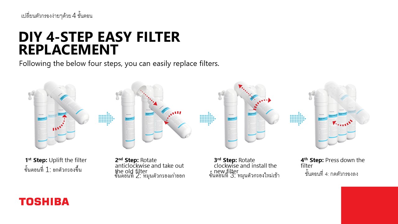 ไฟแจ้งเตือนการเปลี่ยนไส้กรอง และสามารถเปลี่ยนเองได้ง่าย ด้วยระบบ One-Touch Filter